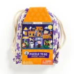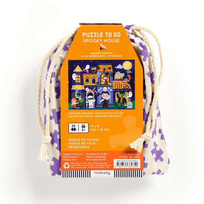 The Spooky House 36 Piece Puzzle To Go, which comes packaged in a 100% cotton drawstring bag, features an adorable scene of a vampire, mummy, and werewolf.