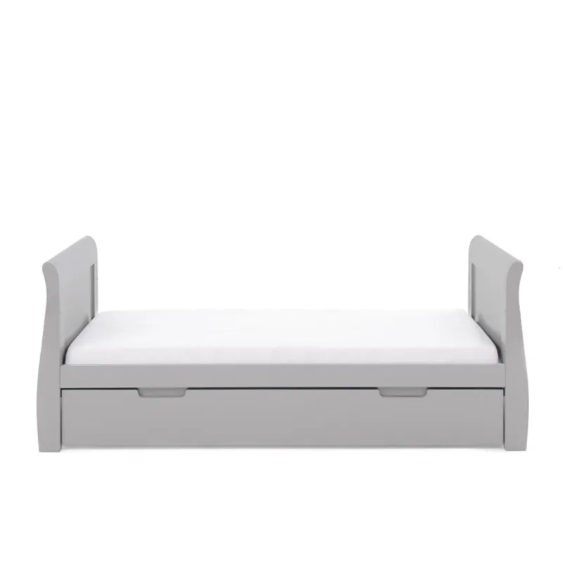 The Stamford furniture range offers families the perfect combination of style, quality, and practicality. At the heart of the range is the beautiful Stamford Classic sleigh cot bed, with its elegant sleigh design offering traditional styling with a contemporary finish.  Teething rails protect your child’s delicate teeth and the slatted sides ensure you can watch over your little one during their most peaceful times. The Stamford Classic offers an adjustable mattress base, the top position allowing you to put down your newborn without unnecessary bending and as your child grows, learning to sit and stand, the base can be lowered by two further positions to ensure your little one is safe and secure at all times. Once your child is old enough the Stamford Classic can be transformed into a stylish toddler bed to provide the perfect night’s sleep up until they are approximately four years old. Requires an 140 x 70cm mattress.  The included matching under drawer has a generous 70L capacity offering parents that much-needed extra storage space for their little one’s belongings, without taking up valuable space elsewhere. Durable wheels ensure that the drawer opens and closes smoothly on any floor surface and recessed handles make sure that there are no protruding handles to catch.  The Stamford cot top changer carefully considers space and design to be the perfect addition to the Stamford Classic cot bed. The space used is cleverly modelled to facilitate the use of a baby changing mat up to 76 x 46cm, while smooth surfaces have been utilized throughout to ensure the unit is a breeze to wipe clean. Suitable from birth to approximately 12 months, the cot top changer is fitted by using a simple and secure Hook and Loop Fastener strap and offers parents the option of front-facing or side-on changing. The two beautiful sleigh side rails ensure your baby is protected from rolling off and provide a convenient way to lift the changer to wherever you may need it next.