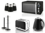 Brand New Swan Retro 1.5L 3KW Retro Jug Kettle, 2 Slice Toaster, 800W 20L Digital Microwave, Tea Coffee & Sugar Canisters, Mug Tree & Towel Pole Matching Kitchen Set of 8 in Black