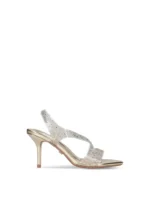 The Carvela Symmetry Court features a clear vinyl upper with gold crystal embellishments. The flattering ankle strap wraps around the foot. Heel height: 80mm.