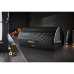 Tidily store your baked produce away within the durable structure of this bread bin. Supporting a roll top lid to grant access to the contents inside, the quality stainless steel material features a black coated V shaped texturing to the roll top lid to add a splash of style across your kitchen side. The large capacity provides plenty of storage space to easily fit a variety of sized loaves, bagels, crumpets and muffins, complete with ventilation holes across the main body so your perishables remain fresher for a longer period of time. The durable metal design is also easy to clean, requiring just a simple wipe down with a damp cloth to maintain. This bread bin forms part of a wider empire kitchen collection which includes a range of essential kitchen and other domestic products, featuring canisters and a mug tree and towel pole set.
