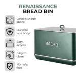 Store all your favourite baked goods in this bread bin by Tower, part of the beautiful Renaissance design collection. This stylish storage solution teams together a unique look of classical antiquity with modern chromed accents, whilst also providing an efficient storage solution. The spacious inner compartment offers plenty of room for a large loaf, ideal for the family. Made from durable iron, it helps to maintain the freshness of your bread, so it always stays tasty for longer. A completely removable lid provides easy access to the contents and the bins clever rectangular shape ensures it fits neatly on top of your kitchen worktop. Complete the unique classical look with Tower’s Renaissance range and retain the trend-setting look across your kitchen appliances. The bread bin forms part of the unique Renaissance breakfast and storage collection, consisting of a Bread Bin, Set of 3 Canisters, and Mug Tree and Towel Pole set.