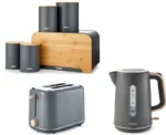 Brand New Tower Scandinavian Style Kitchen Set of 7 in Grey with 1.7L 3KW Rapid Boil Kettle, 2 Slice Toaster, Bread Bin with Chopping Board Lid, 3 Tea, Coffee & Sugar Canisters & Biscuit Barrell. Contemporary Matching Kitchen Set