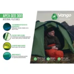 Setting up the Vango Apex Geo 300 is quick and easy, thanks to its simple yet sturdy pole system. The tent comes with alloy poles that are lightweight yet strong, and its flysheet is attached to the poles for added convenience. The tent’s compact size also makes it easy to pitch in tight spaces or on uneven terrain.