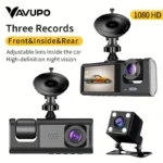 Vavupo 1080P Triple Dash Cam for Cars – Front, Inside & Rear View with IR Night Vision, Loop Recording, Wide Angle Lens, and 2.0″ IPS Display