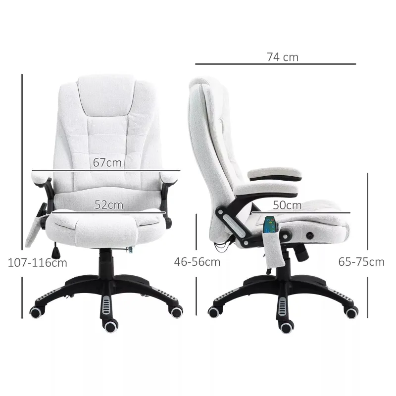 Experience ultimate comfort with the Vinsetto White Upholstered Desk Chair, designed to turn your home office into a personal sanctuary. This chair not only looks elegant with its linen-look upholstery but also offers advanced features like six massage points and a heating function to soothe your body as you work.