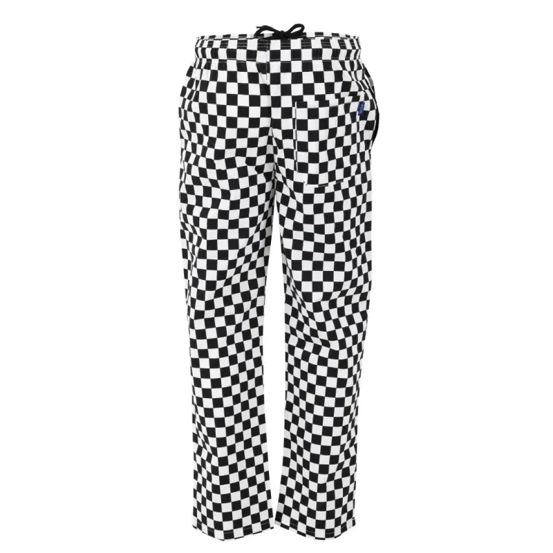The traditional black and white check minimises the visibility of any small spills or stains. And when it’s time to wash, the trousers are suitable for commercial laundering too.