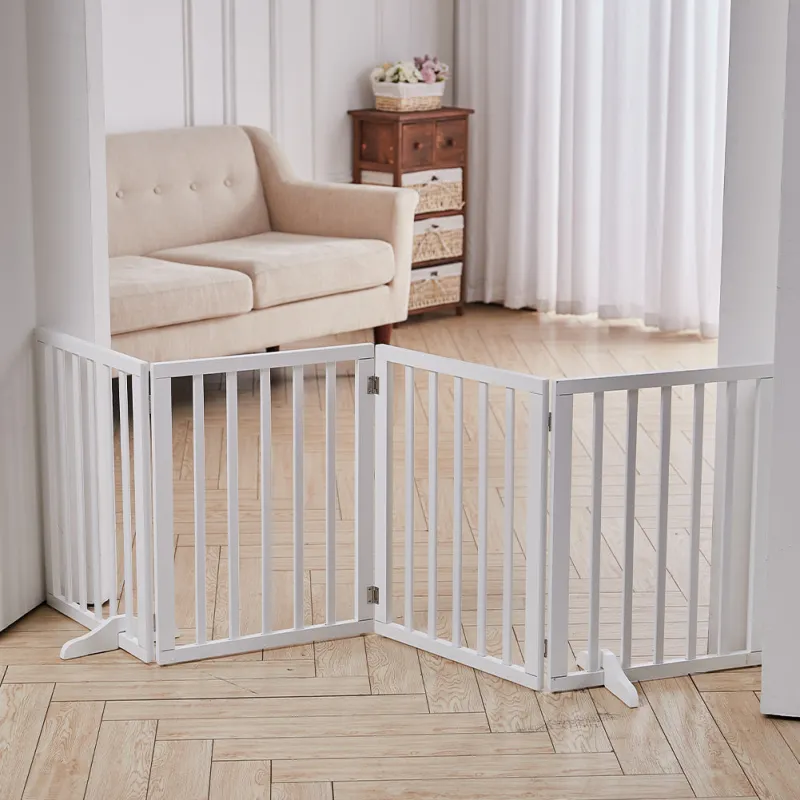 The Wooden Foldable Freestanding 4 Panel Pet Gate offers a secure and effective solution for creating designated play and movement spaces for pets. With its tall design, it serves as a sturdy barrier for larger animals. This gate is constructed with 4 connected panels and durable hinges, allowing it to easily fold into a convenient Z-shaped formation. It can be used as a free-standing gate in entryways, hallways, bedrooms, and staircases.