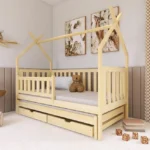 The Wooden Single Bed Tytus transforms your child’s room into a safe and stylish retreat. Crafted from high-quality pine wood and finished with eco-friendly water-based paint, it prioritizes your child’s health. The bed features a convenient trundle for unexpected guests and two large drawers for efficient storage. Its flexible guardrail placement and comprehensive slat kit make it a practical and adaptable choice for modern families.
