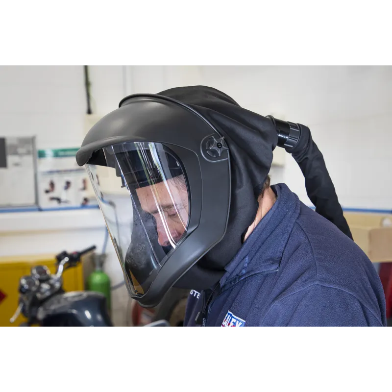 PAPR (Powered Air Purifying Respirator) system with deluxe safety face shield. Lithium-ion battery powered respirator unit provides the user a constant filtered stream of air to their head and face for up to approximately 8 hours. The filter assembly, consisting of a foam pre-filter and HEPA filter, is designed to reduce or remove dust and particles but not vapours and gases. The kit meets performance class TH2 according to EN 12941:1998/A2:2008. Adjustable airflow settings of 150-180L/min. Features an audible alarm to alert user of low battery/low airflow. Polycarbonate visor for increased protection, stability and durability. Ratchet adjustable headband with front and back padding for extra comfort. Suitable for use with standard glasses. Face shield conforms to BS EN 166, Optical Class 1, Impact Grade F.