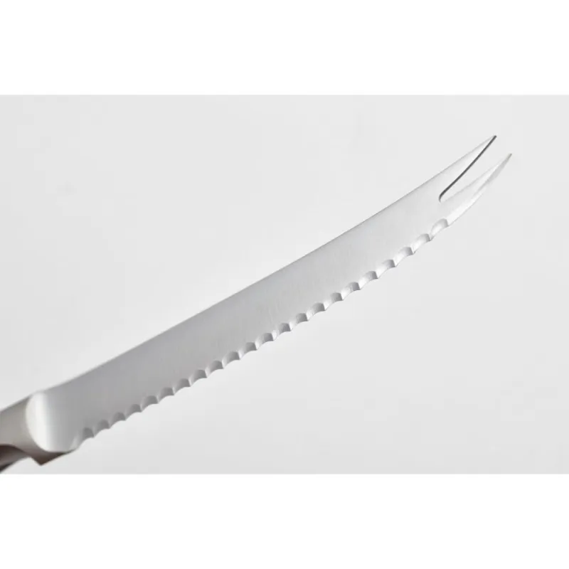 If you love tomatoes with your salads or steaks but hate the mess you create when cutting them then this is the knife you need. The broad serrations will easily pierce and cut the skin while the long blade allows you to make smooth slices. The twin prongs at the tip of the knife make picking up your slices a breeze. This knife will easily slice even the ripest of tomatoes; bring on the mozzarella, basil and olive oil!